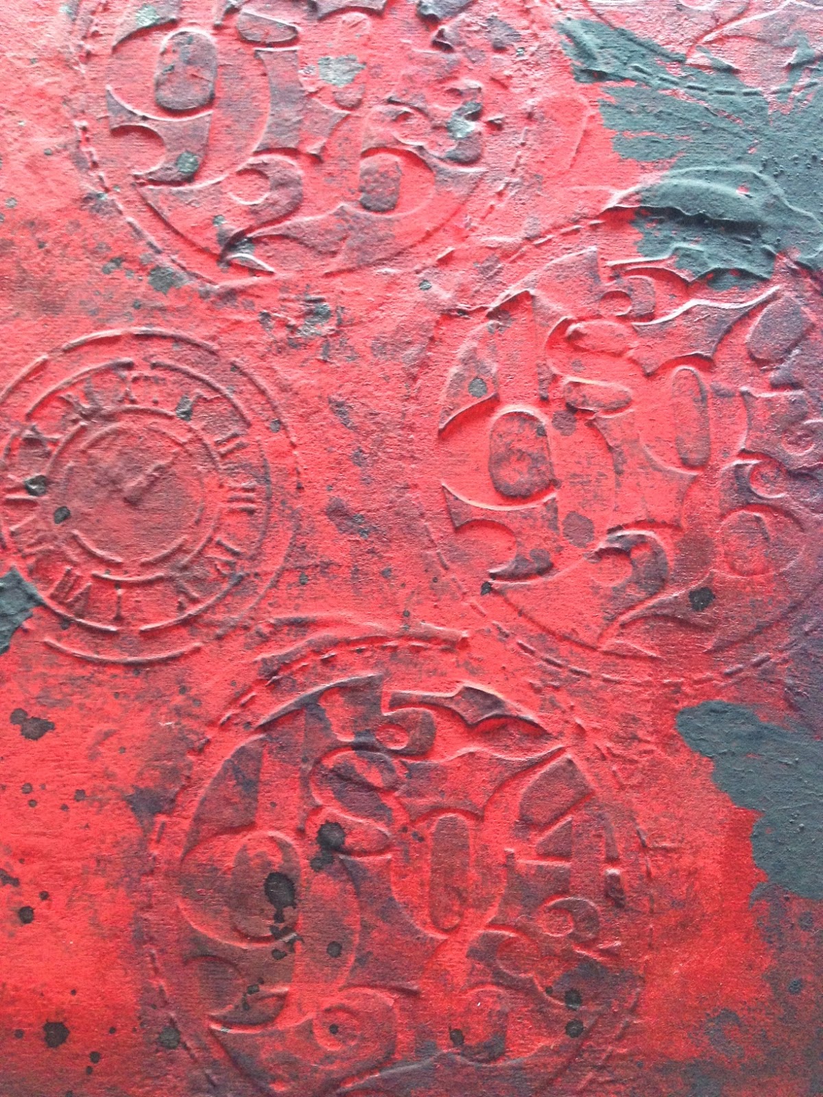 En el lienzo, uso y abuso de mi nueva plantilla circular de números, un reloj precioso que me dejó mi pequeña Marteta, unas mariposas... todo ello con relieve. Color rojo en dos tonos y negro, mucho negro, que es mi color favorito! Iba a añadir algún color más, pero ya me gusta como está. Oh! Y unos goterones de Dylussions negra, por supuesto!